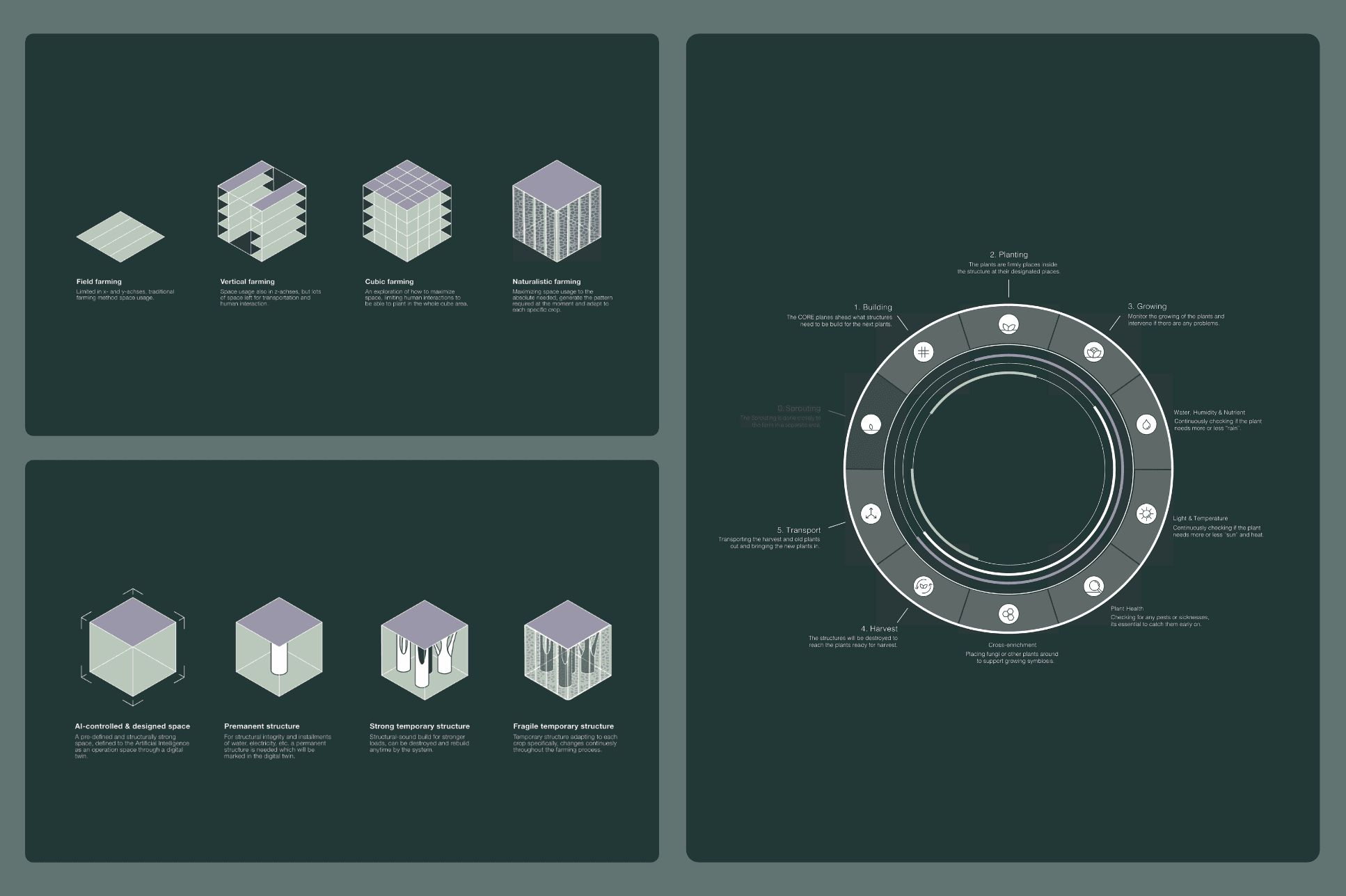 A pivotal aspect of our project was proposing a significant shift from traditional agricultural practices towards more resilient systems. Our chosen concept direction envisions a farming environment where diverse plant species could thrive in symbiosis, promoting biodiversity and ecosystem health. We aimed to move beyond conventional, human-centric farming models, advocating ecosystems that foster natural plant interactions. Our project's cornerstone innovation is the integration of advanced robotics and AI into these polyculture systems.